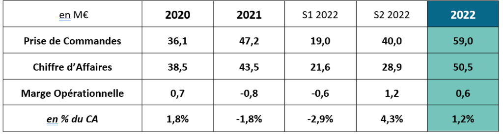 Une nette progression des performances a été enregistrée au second semestre 2022, avec une croissance de 61% des prises de commandes, de 28% du chiffre d’affaires et une rentabilité opérationnelle à 4,3% du CA par rapport à S2 2021.